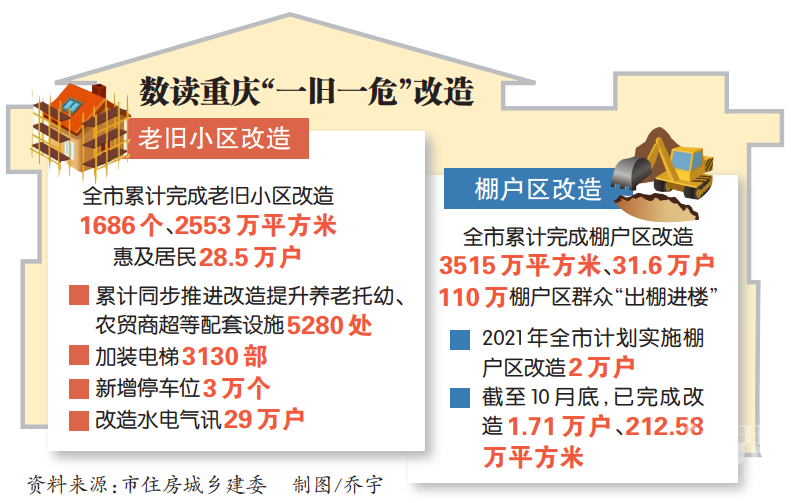 在重庆,像廖雅亿一样从老旧小区“逃离”又“搬回来”的居民绝非少数。市住房城乡建委相关负责人介绍,近年来,我市将老旧小区改造和棚户区危旧房改造作为重大民生工程、发展工程推进实施,截至目前,全市累计完成改造老旧小区1686个、2553万平方米,惠及居民28.5万户;累计完成棚户区改造3515万平方米、31.6万户,110万棚户区群众“出棚进楼”。