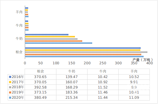 粮食连年丰产丰收,重要农产品供给保障能力稳中有升。全面落实耕地和永久基本农田保护制度,累计建成高标准农田780万亩,划定粮食生产功能区644万亩。持续推进绿色高质高效创建,粮食播种面积稳定在1016万亩以上,2020年全区粮食产量达到380.49万吨,实现“十七连丰”,单产水平位居西北地区第2位。重要农产品供给稳步提升,全面恢复生猪生产,生猪饲养量达到188.6万头,比“十二五”末增长7.7%,完成国家下达生产保供任务的115%。家禽饲养量达到2567万只,肉、蛋、奶总产量分别达到34.1万吨、13.8万吨和215.34万吨。持续抓好蔬菜生产,全区蔬菜面积稳定在300万亩左右,产量达到568.61万吨。稳步推进水产品生产,渔业养殖面积稳定在50万亩左右,水产品产量达到16.16万吨。