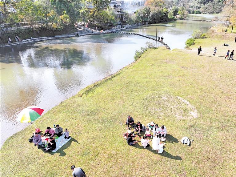 12月5日,游客在锦屏县敦寨镇雷屯村沙洲坝游玩拍照。初冬时节,雷屯村瓜果飘香,集果蔬体验采摘、吃住玩乐于一体,成为休闲垂钓采风好去处。