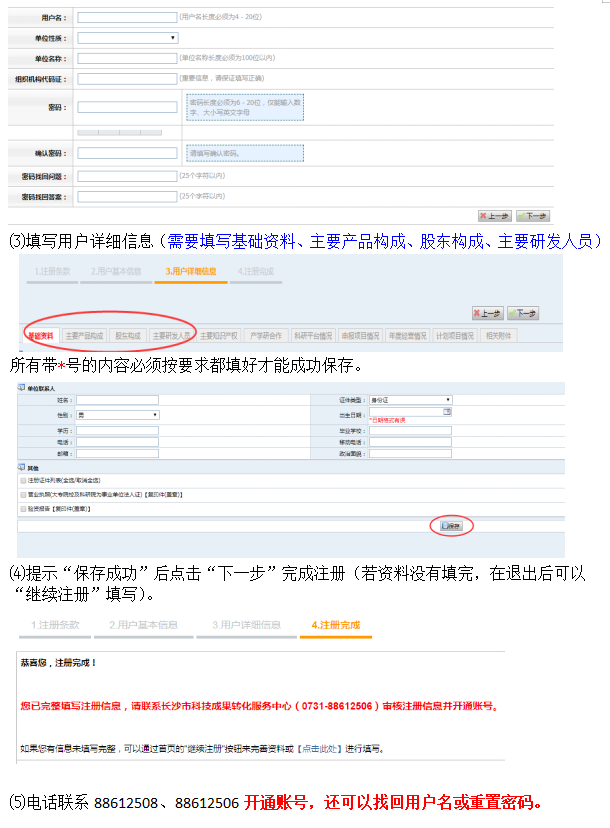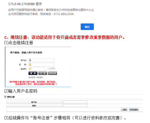 未审核开通账号(即不能登录)的,可以在登录页面点击“继续注册”进入系统,任何信息都可以修改,修改保存后电话联系88612508/88612506开通账号。