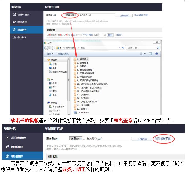 点击填报导航的“项目附件”上传附件,注意:所有附件均以PDF格式分别上传,请根据两型产品“项目申请表”的条目做好目录建议如下: