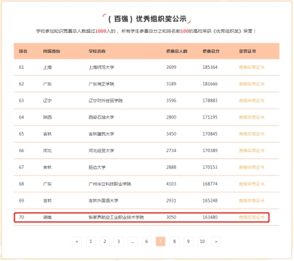 9月,由“易班网”主办,在“易班优课”平台线上开展全国“2021年易班优课大学生党史学习知识竞赛”活动,在参加活动的全国共848所高校中我校排名第70位,湖南73所高校中我校排名第6位,荣获百强高校“优秀组织奖”,二级学院等部门10名教师获评此项活动优秀指导教师,1231名学生获得《电子学习证书》。