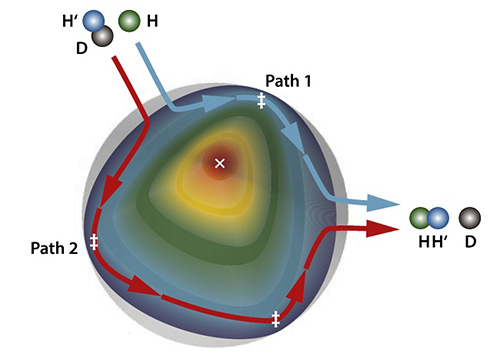化学反应的进程伴随着复杂的量子力学现象,但其通常难以被直接观测到,因而化学反应的本质亦难以得到透彻的理解。我所杨学明院士、张东辉院士、孙志刚研究员和肖春雷研究员团队提供了一个研究范例。他们研究发现,在H+HD→H2+D反应中,在碰撞能量为1.9~2.2电子伏的范围内,产物H2(v’=2,j’=3)的后向散射呈现显著的振荡(其中v’是振动量子数,j’是转动量子数)。通过拓扑理论分析,他们发现该反应存在两条迥然不同的反应路径,振荡是由这两条路径之间的量子力学干涉所产生的。该研究揭示了该反应在较低能量处,量子几何相位效应仍然存在,并可以被观测到。这非常类似于众所周知的Aharonov-Bohm效应,清晰地揭示了化学反应的量子性。