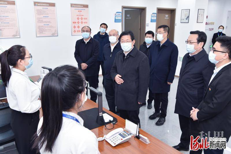12月4日,省委宣讲团团长、省委书记、省人大常委会主任王东峰到雄安新区宣讲党的十九届六中全会精神并调研检查。这是王东峰、王正谱在胡村社区党群服务中心,看望慰问社区工作者。 河北日报记者赵海江摄