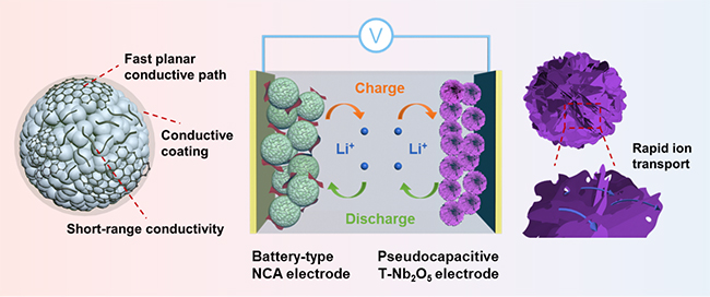 以锂离子电池和超级电容器为代表的电化学储能器件得到了广泛应用。然而,传统锂离子电池受限于迟缓的体相反应而具有较差的功率性能;超级电容器利用快速的表面过程存储电荷,但受限于较低的能量密度。二者之间存在巨大的性能空白,难以满足同时对能量和功率密度有较高要求的应用场景。将电池电极和超级电容器电极集成在一个器件内,有望结合两种储能机理的优势,获得“双高”的电池—超级电容器混合储能器件。此前研究工作主要利用电池型负极和双电层电容型正极器件,该器件构型充放电过程所需的离子由电解液提供,与摇椅式工作机理的锂离子电池相比需要消耗大量的电解液。此外,电池—超级电容器混合储能器件的性能又受到电池型电极和电容型电极之间极不匹配的电荷存储容量和电极动力学的限制。