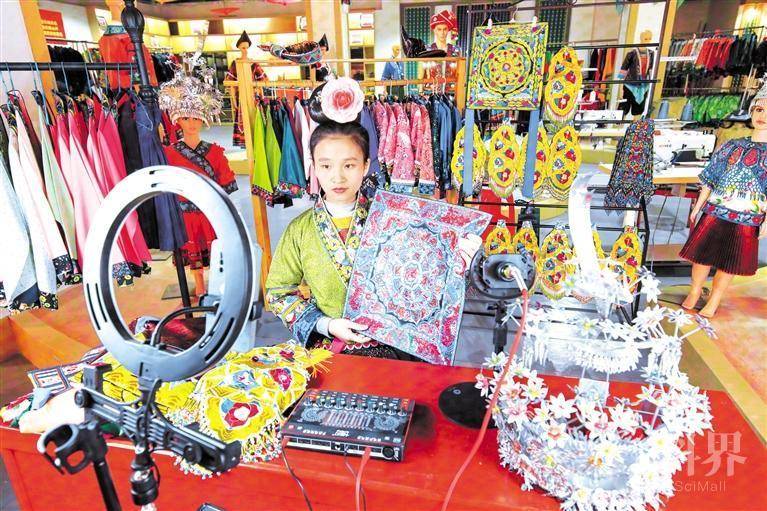 12月10日,在从江县美娥社区一家民族服装企业内,一名主播通过网络直播推介苗族刺绣制品。