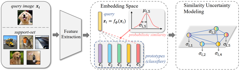 小样本学习可以降低机器学习算法的数据依赖性,对于实际应用意义重大。其中,小样本图像分类旨在从少量标注样本中学习识别新的类别。在该领域中,基于度量学习的方法得到了广泛研究并取得了显著效果。具体而言,这种方法是按照特征空间相似度将待分类样本与支持集合中最近邻的类中心进行匹配,进而实现分类的。但是,由于观测噪声的存在,网络模型对于不同输入对应的特征表达具有不同的置信度。对不确定度的建模和利用,对于提升小样本学习的优化效率十分重要,但这在以前却经常被忽略。