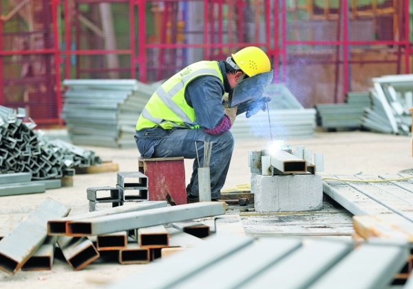 工人在贵州省档案馆新馆一期工程及贵安新区档案馆、城建档案馆施工现场焊接钢材。