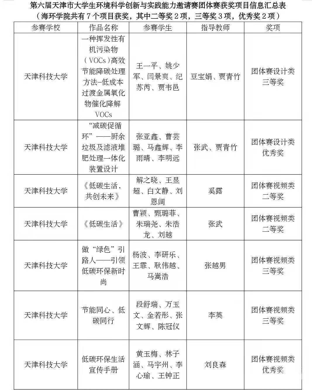 近日,第六届天津市大学生环境学科创新与实践能力邀请赛团体赛落下帷幕,天津科技大学共有7个项目获得市级奖项,其中二等奖2项,三等奖3项,优秀奖2项。由豆宝娟、贾青竹老师指导的王一平、姚少军、闫景爽、纪苏芮、贾韦邑同学的参赛作品《一种挥发性有机污染物(VOCs)高效节能降碳处理方法——低成本过渡金属氧化物催化降解VOCs》荣获团体赛设计类三等奖;由张武、贾青竹老师指导的张亚鑫、曹芸璐、马鑫辉、李雨晴、李明远同学的参赛作品《“减碳促循环”——厨余垃圾及滤液堆肥处理一体化装置设计》荣获团体赛设计类优秀奖。由奚露老师指导的谢之晓、王昱超、白文静、刘恩阔同学的参赛作品《低碳生活,共创未来》,由张武老师指导的曹颖、甄璐菲、朱瑞尧、朱浩龙、刘越同学的参赛作品《低碳生活》两个作品荣获团体赛视频类二等奖;由张越男老师指导的杨波、李研乐、王菲、耿伟越、马嵩浩同学的参赛作品《做“绿色”引路人——引领低碳环保新时尚》,李英老师指导的段舒瑞、万玉文、金若彤、张文辉、陈冠仪同学的参赛作品《节能同心、低碳同行》两个作品荣获团体赛视频类三等奖;由刘良森老师指导的黄玉梅、林子涵、马宇州、李心瑜、王钟正同学的参赛作品《低碳环保生活宣传手册》荣获团体赛视频类优秀奖。