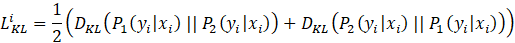 具体来说,当给定训练数据 D={x_i,y_i }_(i=1)^n 后,对于每个训练样本 x_i,会经过两次网络的前向传播,从而得到两次输出预测:P_1 (y_i│x_i ), P_2 (y_i |x_i)。由于 Dropout 每次会随机丢弃部分神经元,因此 P_1 和 P_2 是经过两个不同的子网络(来源于同一个模型)得到的不同的两个预测概率(如图1所示)。R-Drop 利用这两个预测概率的不同,采用了对称的 Kullback-Leibler (KL) divergence 来对 P_1 和 P_2 进行约束:
