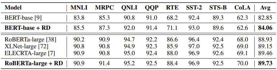 表3:R-Drop 在 GLUE 语言理解的验证集上的微调结果