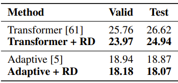 5. 在语言模型任务上,基于原始 Transformer 以及 Adaptive Transformer [8],R-Drop 的训练在 Wikitext-103 数据集上取得了1.79和0.80的 ppl 提升: