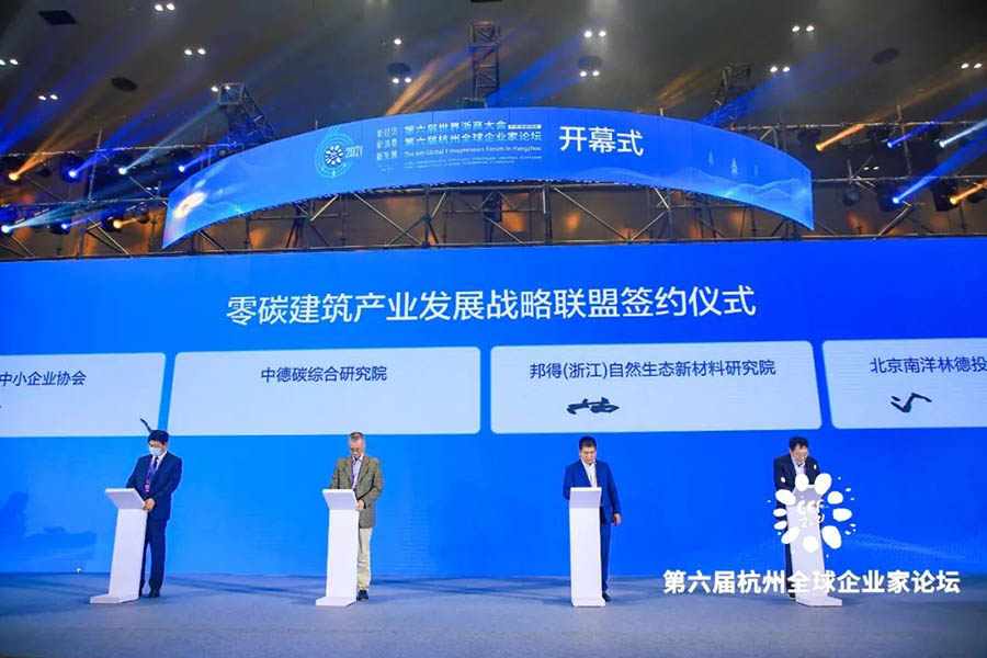 浙江省中小企业协会、中德碳综合研究院、邦得(浙江)自然生态新材料研究院、北京南洋林德投资管理公司签订了零碳建筑产业发展战略联盟签约仪式