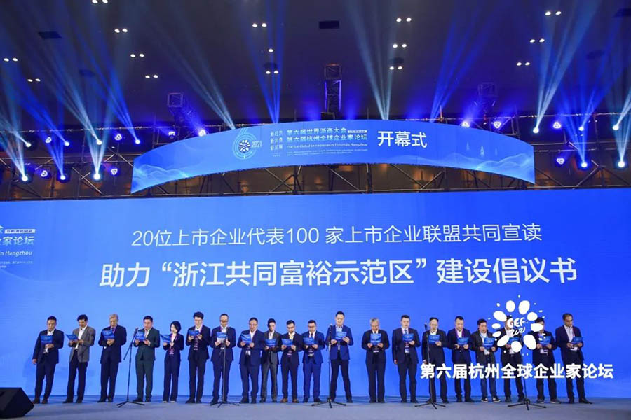 此外,开幕式上,浙江省中小企业协会联合浙江花园生物高科股份有限公司、桐昆集团股份有限公司、春秋航空股份有限公司、浙江银轮机械股份有限公司、杭萧钢构股份有限公司、寿仙谷药业股份有限公司、佩蒂动物营养科技股份有限公司、森林包装集团股份有限公司、杭州沪宁电梯部件股份有限公司、浙江天宇药业股份有限公司、正康股份、万通智控科技股份有限公司、大连圣亚旅游控股股份有限公司、浙江宏昌电器科技股份有限公司、浪莎控股集团有限公司、杭州有赞科技有限公司、施耐德电气等20家上市企业代表发起了“浙江省上市企业服务联盟”致助力共同富裕倡议书。高质量发展建设共同富裕示范区,是党中央国务院赋予浙江的光荣使命。为积极助力浙江高质量发展建设共同富裕示范区建设,先富带后富、推动共同富裕,是我们民营企业的光荣历史使命和义不容辞的社会责任。