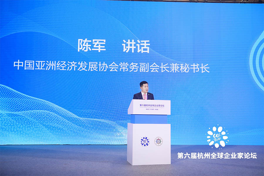 10月31日上午,由中国亚洲经济发展协会联合主办的2021第六届杭州全球企业家论坛暨中国消费品博览会开幕式在杭州国际博览中心隆重召开。十二届全国人大常委会副委员长陈昌智、中国国际经济技术合作促进会理事长杨春光、浙江省政协副主席陈小平、浙江省工商联林建良副主席、中国亚洲经济发展协会常务副会长兼秘书长陈军、中国建设银行浙江省分行党委书记、行长邵斌出席了开幕式。场内座无虚席,现场人声鼎沸,中国国际经济技术合作促进会杨春光理事长、浙江省工商业联合会林建良副主席、中国亚洲经济发展协会常务副会长兼秘书长陈军、中国扶贫开发协会乔传福副会长、浙江省中小企业协会邵钦祥会长,启动了大会开幕仪式,点燃了专属于2021第六届杭州全球企业家论坛的火热盛况。