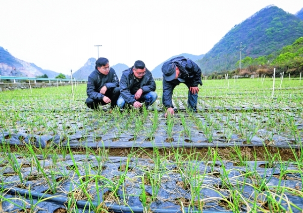 马场镇场边村驻村干部和村民在查看香葱长势。