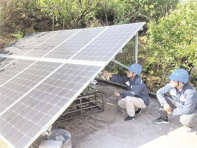 电科院专家在安顺镇宁张其公变光伏台区调研光伏板运行情况。
