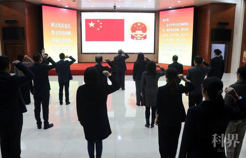 宣誓仪式现场庄重、严肃,国旗、国徽高悬,宣誓台上摆放着《中华人民共和国宪法》。全体肃立,奏唱中华人民共和国国歌。随后,2020年9月以来省科技厅任命的23名公务员依法进行宪法宣誓。领誓人手抚宪法,领诵誓词,宣誓人着装严整、列队整齐,跟诵誓词。