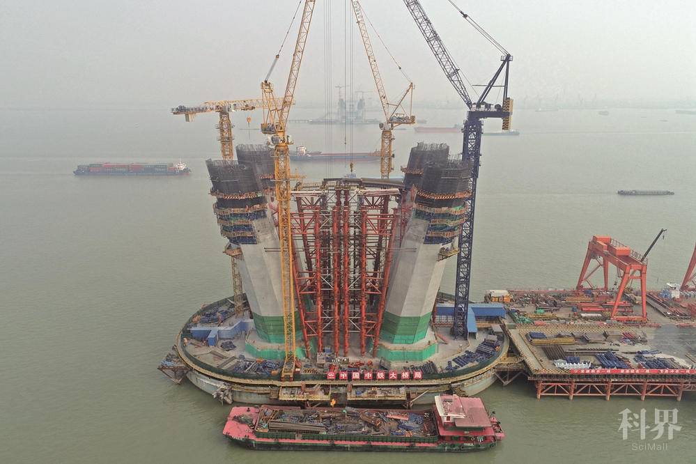 记者13日在常泰长江大桥施工现场看到,由中铁大桥局承建的常泰长江大桥常州一侧主塔下塔柱已完成施工,进入下横梁施工阶段。