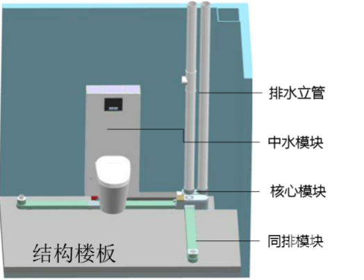 地上部分为中水模块,用于储存和处理核心模块收集后的户内三洗废水,内部集成了便器冲水箱,与落地后排水分体坐便器连接,构成了一个具有中水处理功能的户内中水冲厕系统。直接将处理合格的户内中水冲进便器,实现中水洁厕。。