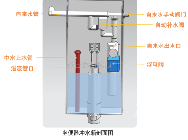 在中水模块内的冲水箱内按照《建筑给水排水设计规范》(GB50015)要求,采用上出水进水管设计,满足隔断要求,不会存在水箱内的无压水倒流进入自来水管内的条件。不存在户内中水污染倒流进入自来水的可能性。见图4.