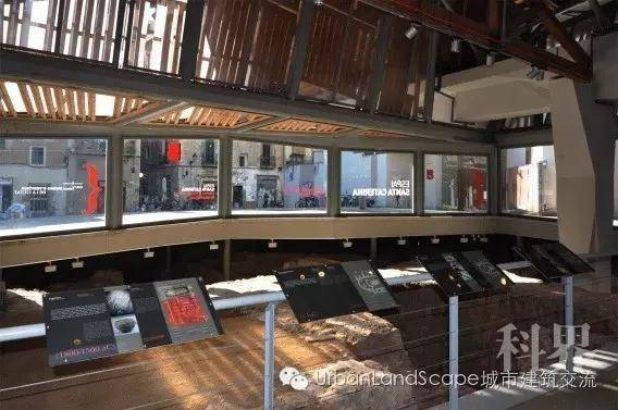 在建筑形态方面,设计保留了老市场三面外墙,并以色彩艳丽、起伏夸张的屋面覆于其上,形成拥有强烈冲击感的新旧并置的对立关系(图3)。值得一提的是,在市场的改造过程中发现了地面以下不同时期的历史遗迹,建筑师不得不调整改造策略,并于市场面向内部广场的一角辟出一块空间用于呈现遗迹(图5)。对历史的敬畏让历史得以顺畅地流出并与当代人们的生活发生连接。于是,新与旧、当下与历史、日常的琐碎与宗教的神圣碰撞而生的冲突感与丰富性构成圣卡特莱纳市场独特的魅力。