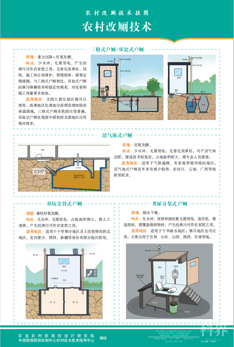 本系列挂图,以卡通漫画的形式对我国农村使用较多的7种厕所的建设和管理要点进行了科普。从选型、建造、启用、清掏、维护、安全等不同阶段进行了详细介绍。挂图中内容生动形象,文字言简意赅,以通俗易懂的方式详细讲解了农村改厕过程中所涉及的技术问题,可为农村户厕的技术选取、工程建设、运行维护起到一定的技术指导作用。