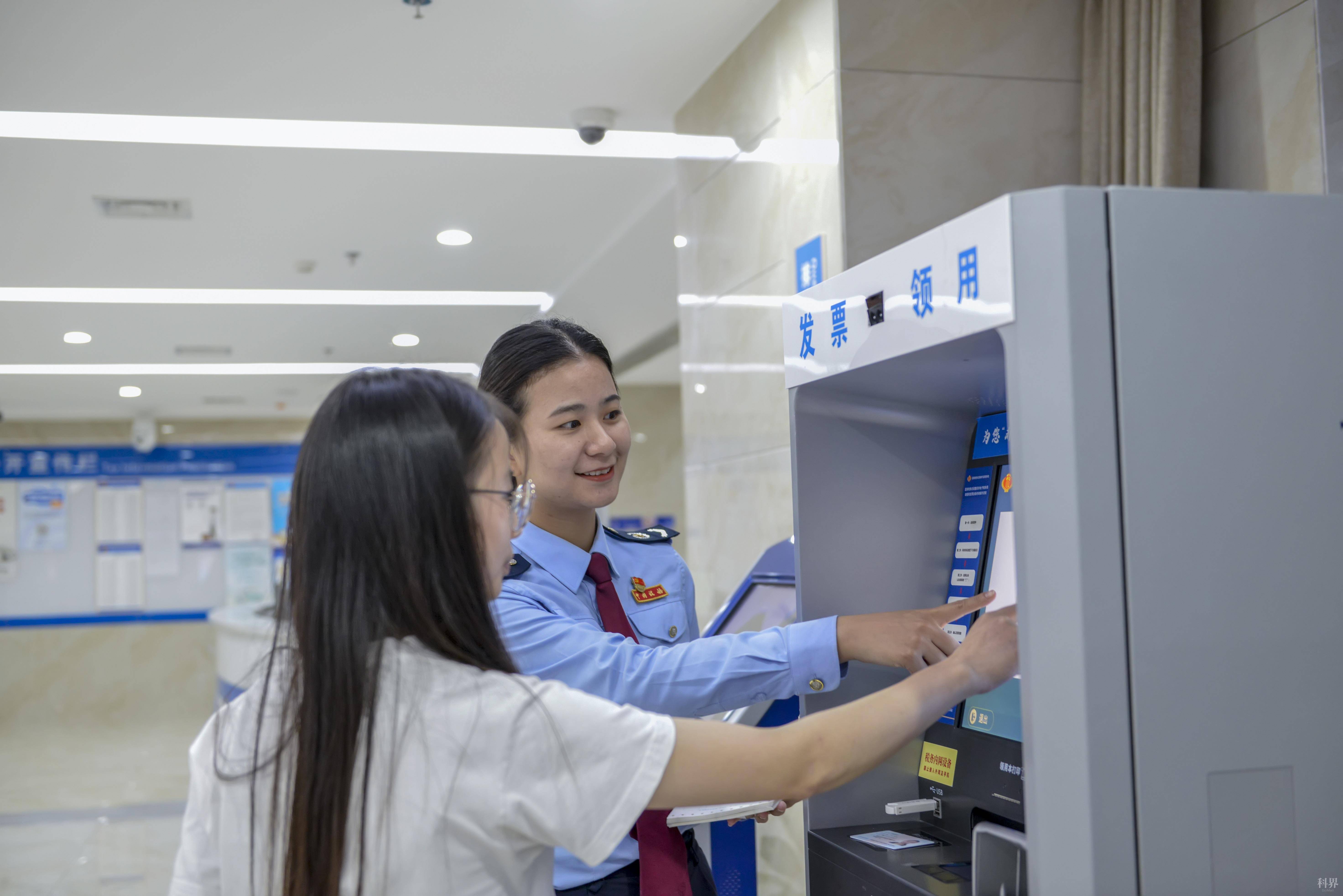 奉节县税务局办税服务厅工作人员辅导市民通过自助办税设备领用发票。