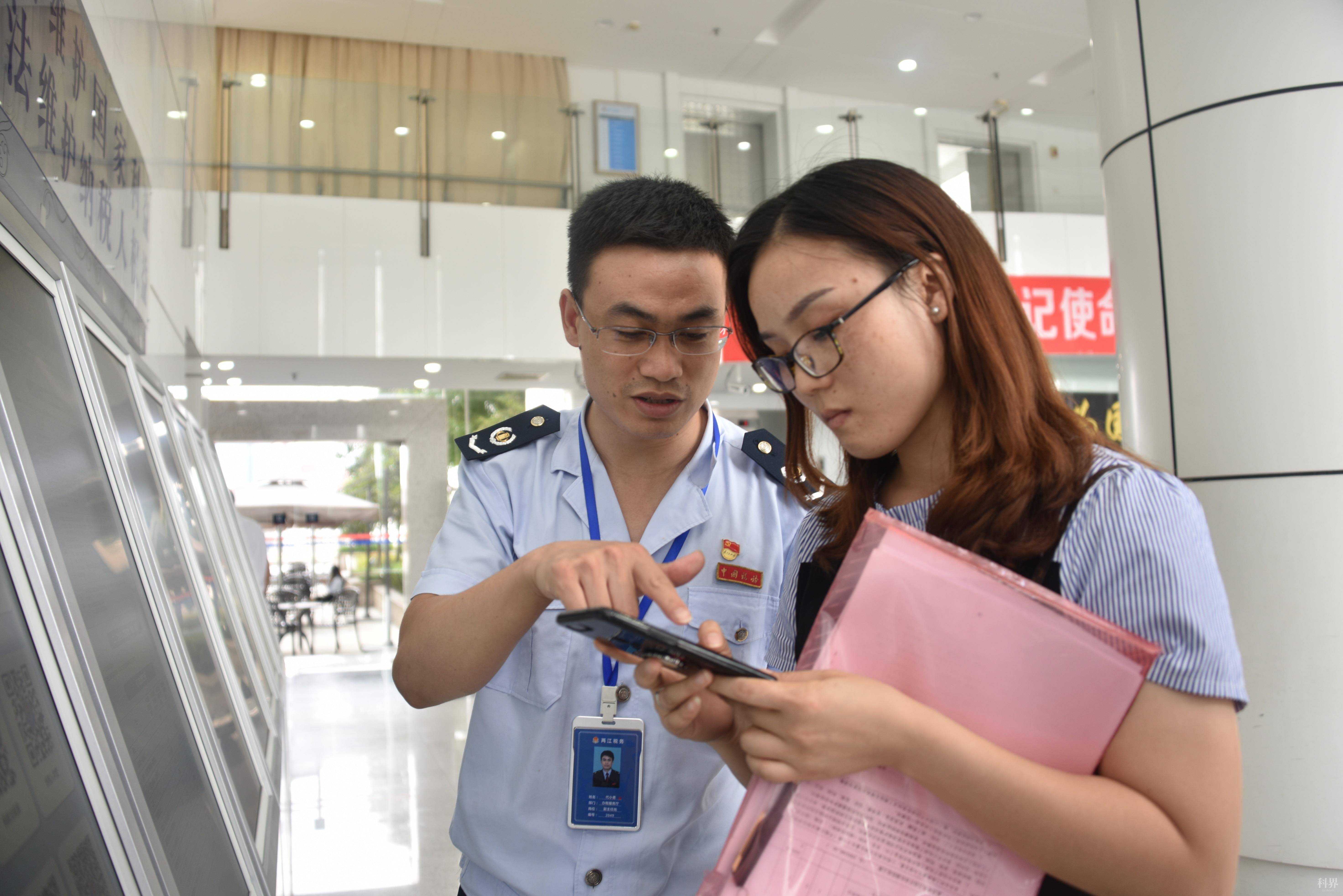 两江新区税务局办税服务厅工作人员指导市民通过微信办税。