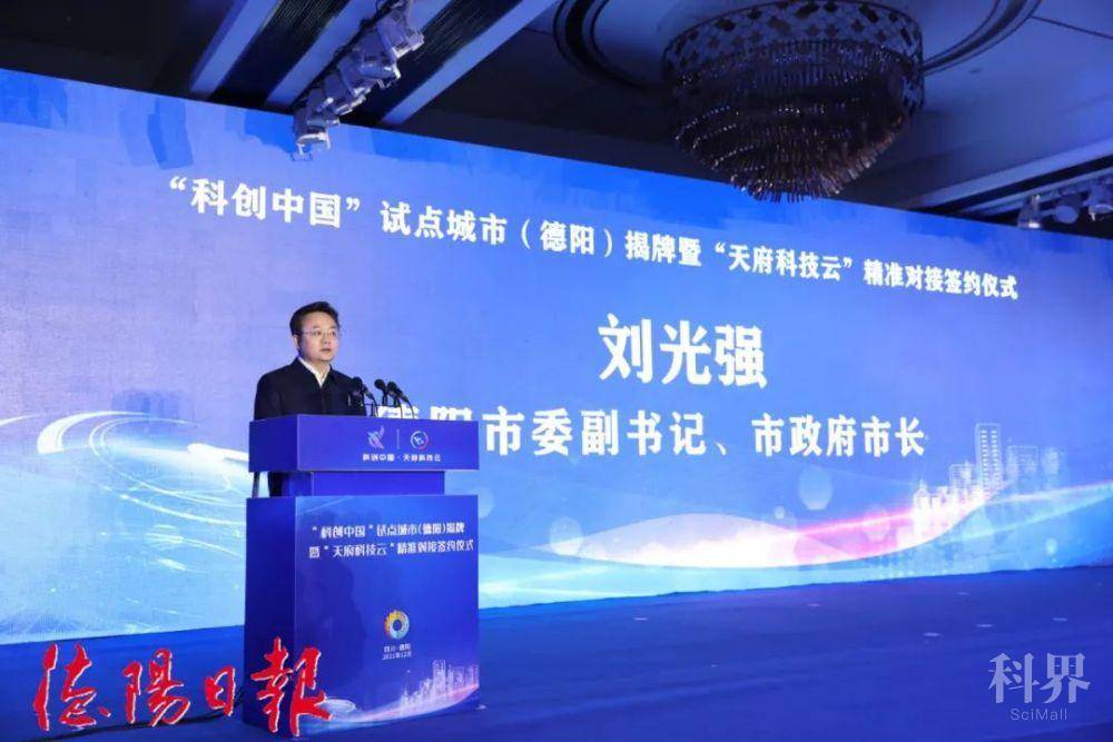 12月16日下午,由中国科学技术协会指导,四川省科学技术协会、德阳市人民政府主办的“科创中国”试点城市(德阳)揭牌暨“天府科技云”精准对接签约仪式在德阳举行。中国科协党组副书记徐延豪,四川省科学技术协会党组书记、副主席毛大付,市委副书记、市长刘光强共同揭牌并见证签约。市委副书记罗文全出席仪式。