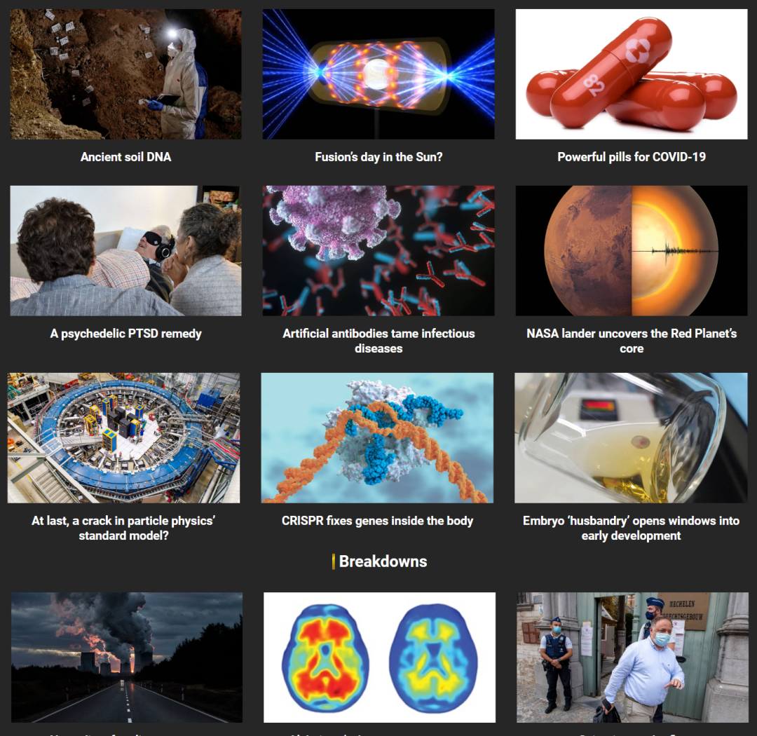 除此之外,年度科学突破还包括:开发针对 COVID-19 的抗病毒药、μ 子的新测量、火星地震观测、从土壤恢复古代人类 DNA、CRISPR 体内应用、对早期人类发展的新见解、使用迷幻类药物治疗 PTSD、开发用于治疗传染病的单克隆抗体以及聚变能生成的进步。