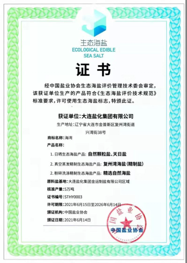 大连盐化集团海湾牌生态海盐系列产品通过中国盐业协会生态海盐评价管理技术委员会审定,获得由中国盐业协会颁发的生态海盐证书,许可使用生态海盐标志。海湾牌生态海盐产品,是以无污染海水为原料,在优良自然生态环境下,按照《生态海盐评价技术规范》标准生产,实行全程质量控制,符合绿色发展理念的优质食盐。生态海盐产品上市后,将引领食用盐生态、绿色消费。