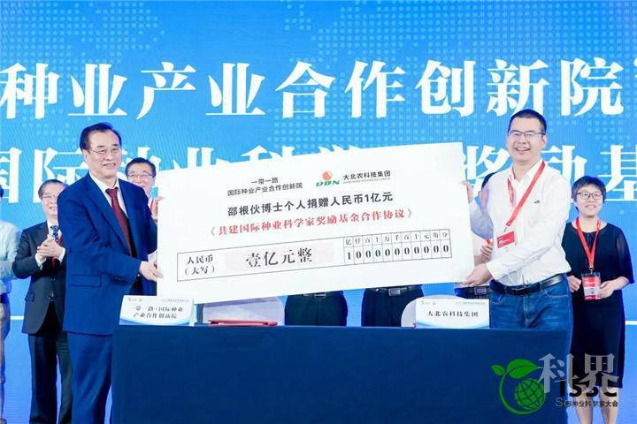 在大会上,大北农科技集团董事长邵根伙博士个人无偿出资一亿元(人民币,下同),与“一带一路”国际种业产业合作创新院共建“国际种业科学家奖励基金”,该基金计划每年出资一千万元,重点奖励上一年度在植物、动物、微生物种业领域作出贡献的科研从业工作者。
