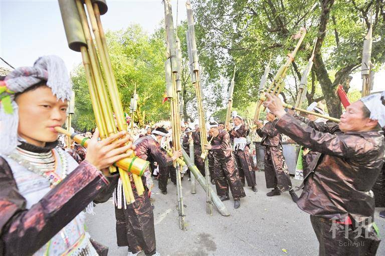 12月22日,从江县丙妹镇岜沙苗寨芦笙手在吹奏芦笙。