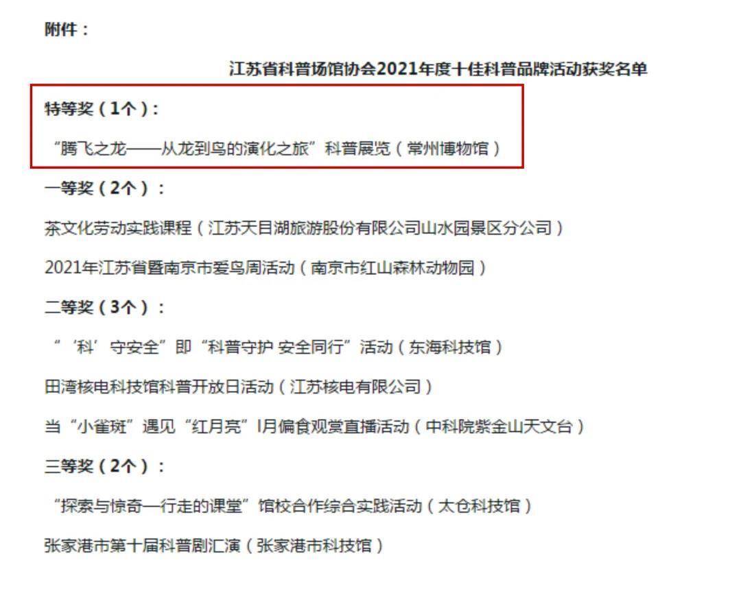 根据江苏省科普场馆协会年度十佳品牌活动和年度优秀网站评选条件,经各会员单位自愿申报、协会组织专家评审及上网公示,并报协会常务理事会批准,决定对常州博物馆“腾飞之龙——从龙到鸟的演化之旅科普展览”授予2021年度十佳科普品牌活动特等奖,常州博物馆等9家单位网站2021年度优秀网站称号。由于常州博物馆成绩突出,专家评委组商定,本次评选专门增设了特等奖。