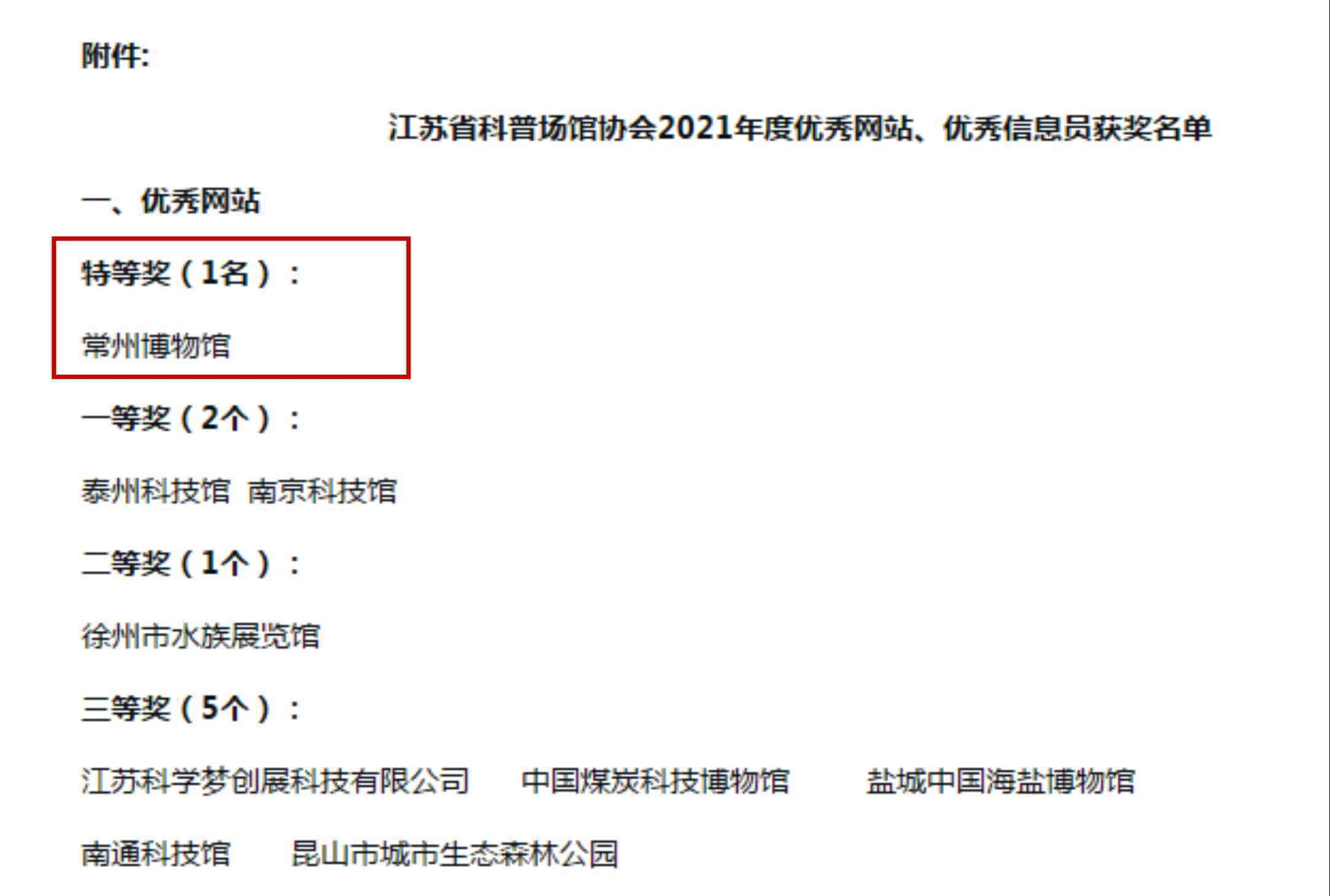 热烈祝贺常州博物馆在江苏省科普场馆协会2021年度十佳科普品牌活动、优秀网站评选中拔得头筹,喜获两项特等奖,赢得双丰收!
