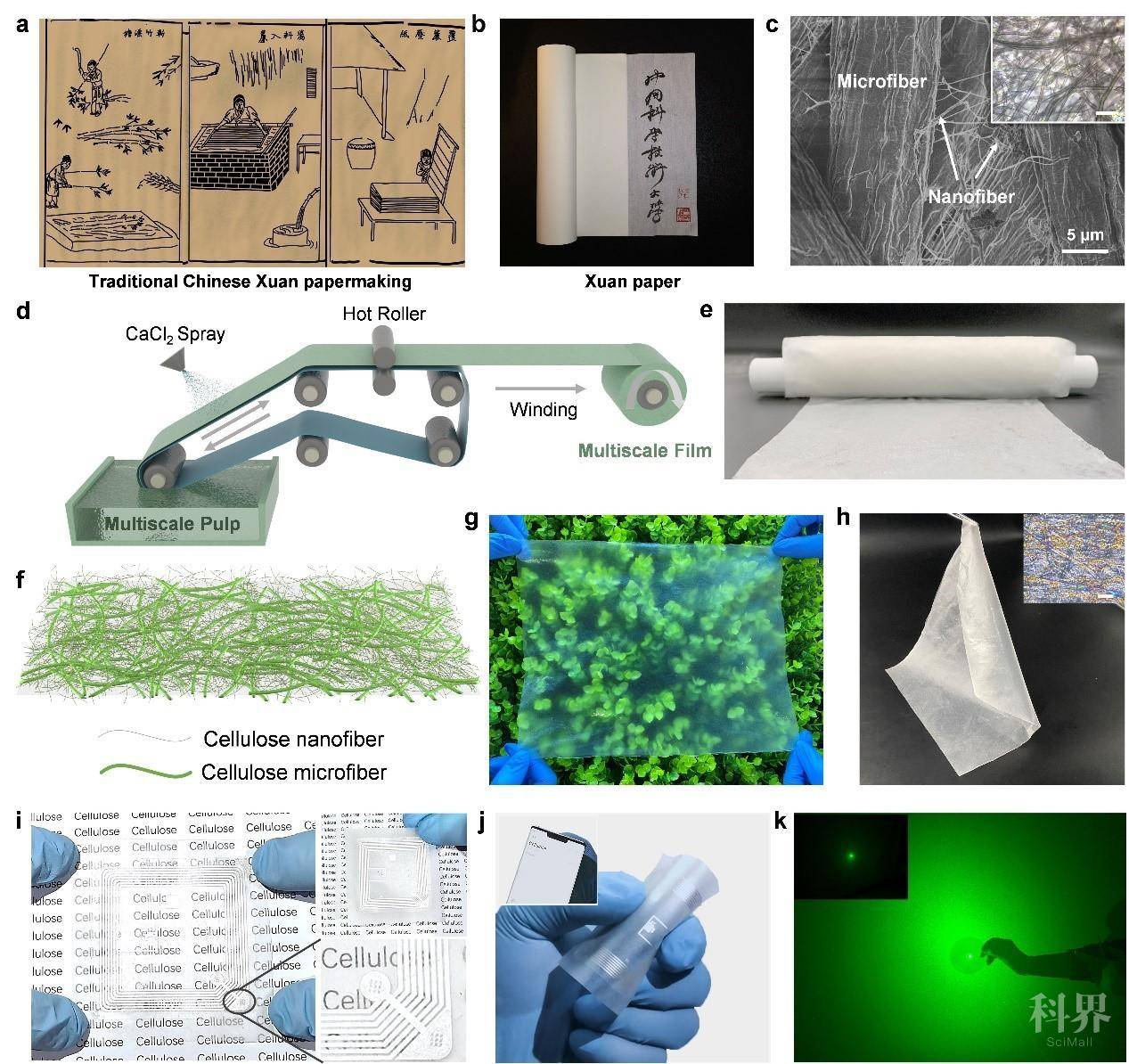 科研人员通过研究发现,宣纸内部具有大量的纳米纤维和微米纤维相互交织,形成了微米纳米多尺度的三维网络,这种仿生多尺度结构赋予了宣纸高强度,高柔韧性的力学优势。受宣纸多尺度结构的启发,研究人员通过将微米纤维素和纤维素纳米纤维组装成多尺度结构,制备了高性能高雾度透明薄膜。