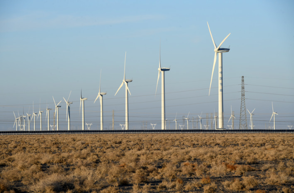 这是2021年12月8日拍摄的中节能(甘肃)风力发电有限公司玉门昌马风电场的风机。 新华社记者 范培珅 摄