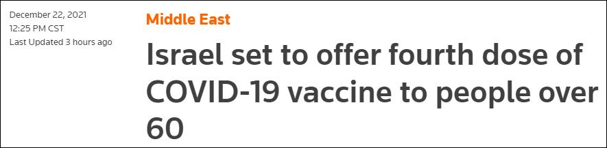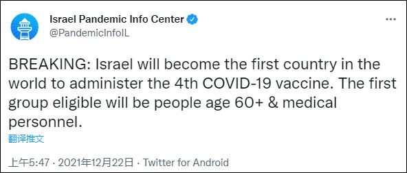 以色列政府的疫情信息中心发推称,“以色列将成为世界上第一个接种第四针新冠疫苗的国家。”