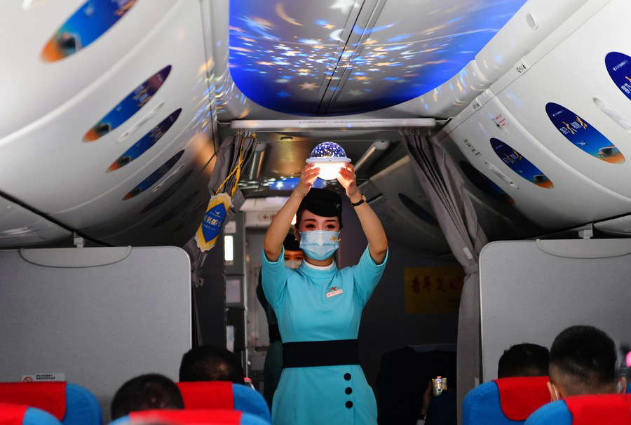 2020年8月5日,厦航“大兴号”涂装飞机首飞,首航乘务员为旅客进行特色表演。当日,一架蓝白相间涂装、编号B-5656的厦航飞机降落在北京大兴国际机场的跑道上,标志着厦航“大兴号”涂装飞机首飞圆满成功。 新华社记者魏培全摄