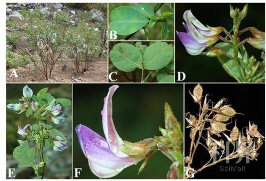 E枝和花序,F放大的花(旗瓣、翼瓣、龙骨瓣与花萼),G果序与荚果。 (成都生物所供图)