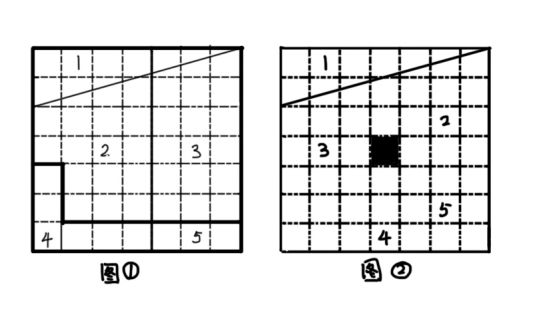 将一张方格纸按图1所示画上正方形,然后沿图中所示的直线切割成5小块。当按照图2所示将这些正方形重新拼接成正方形时,中间竟然会出现一个空缺的小洞。被切割的图1是由49个正方形组成,但是拼接成的图2竟然只有48个。那么,失踪的正方形去哪了呢?