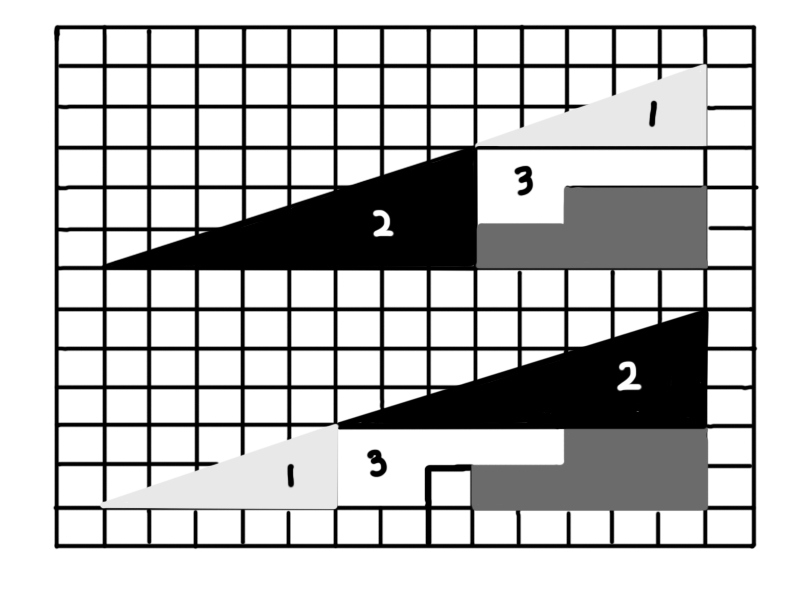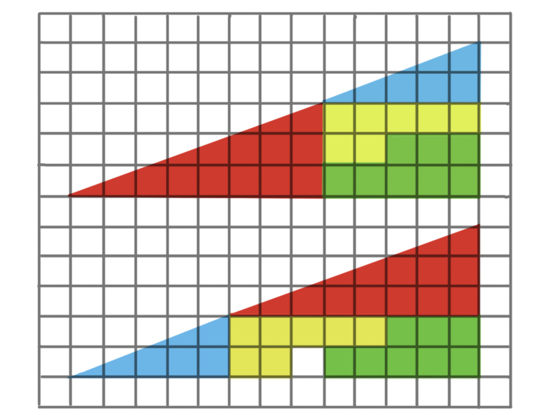 加德纳把一个“三角形”分成特定的四块,然后把它重新组合成“新三角形”,这个“新三角形”与“原三角形”形状相似,但是却少了一格的面积。需要申明的是,在重新组合的过程中,没有对这四块图形做过任何手脚,但为何就是少了一个正方形呢?这让很多人困惑不解。
