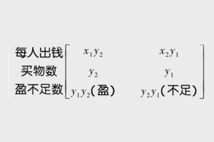 根据上面的矩阵我们可以知道,第一次交易盈余y1y2元;第二次交易还差y1y2元。如果将两次交易相加,买y1+y2个物品,则盈余、不足抵消,即“不盈不亏”。也就是,买1件物品时,每人应出钱:(x1y1+x2y2)/(y1+y2)元。
