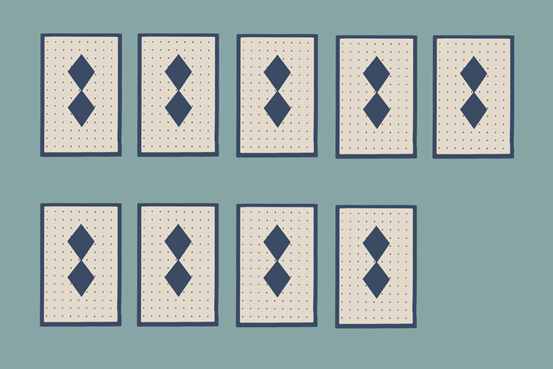 如下图所示,假设有9张背面向上的扑克牌,如果每次随机任意翻动2张扑克牌,其中可以包括已经翻过的牌,改变它们的展示方向,如此这般循环操作,最终是否会出现所有牌都正面向上的结果呢?答案是否定的。你能说出这其中的数学道理吗?