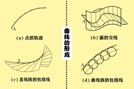 第三,一条线(直线或曲线)运动过程中的包络线(直线族或曲线族的包络线)中,线族的每一条线都与包络线相切后产生的线就是曲线。