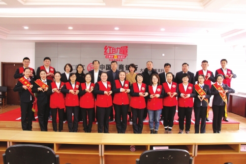 党旗在一线高高飘扬,共产党员发挥模范带头作用做好金融服务先锋队。图为工商银行大连普兰店支行“工行驿站”志愿者服务宣传月活动启动会。