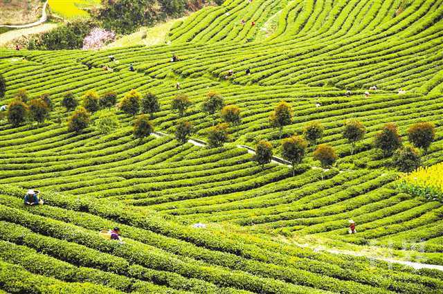 离县城二十多公里的兴隆坳现代农业示范园区内,是连片的茶园。茶园随山丘起伏,在碧蓝的天空下勾勒出碧绿的线条。