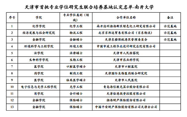 此次认定的联合培养基地中,3基地获评天津市示范基地,分别是化学学院与南开沧州渤海新区绿色化工研究有限公司联合建立的化学工程联合培养基地,经济与社会发展研究院与北京京邦达贸易有限公司(京东物流)建立的物流工程联合培养基地,金融学院与天津东疆保税港区管理委员会联合建立的金融硕士联合培养基地。