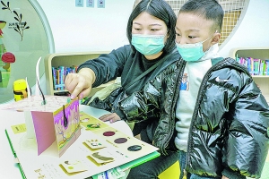 近日,市民钱湘俊在图书馆3楼的亲子阅览区,陪伴孩子体验有声阅读空间。在这里,只要将书放在桌面识别区内,机器就能将书上的内容读给孩子听。“这里的书籍很丰富,查书也很方便,各种设备有满满的科技感,孩子很喜欢,听书特别认真。”钱湘俊说。